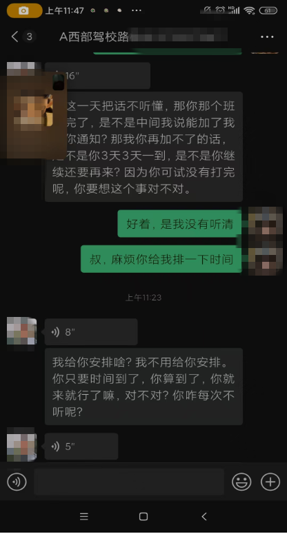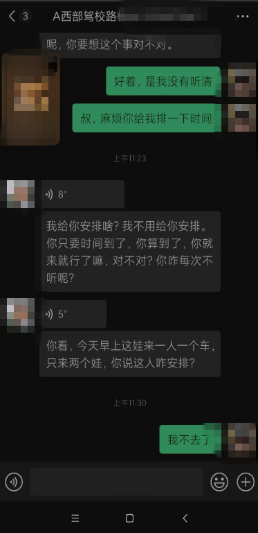 4.當(dāng)事人張某于2025年6月26日在終南鎮(zhèn)西部駕校報(bào)名,交費(fèi)3300元人民幣。7月19日通過科目一考試,7月20日起連續(xù)4天進(jìn)行科目二訓(xùn)練,此后未再進(jìn)行科目二練習(xí)。當(dāng)事人一段時(shí)間后與教練溝通練車時(shí)間,教練告知三天為一循環(huán)進(jìn)行訓(xùn)練,當(dāng)事人表示并不知情。溝通無果,且因教練態(tài)度較差,當(dāng)事人不愿再繼續(xù)學(xué)習(xí),并要求退費(fèi)。8月13日,駕校負(fù)責(zé)人與當(dāng)事人溝通協(xié)商,最終為當(dāng)事人更換駕校教練,當(dāng)事人表示滿意。